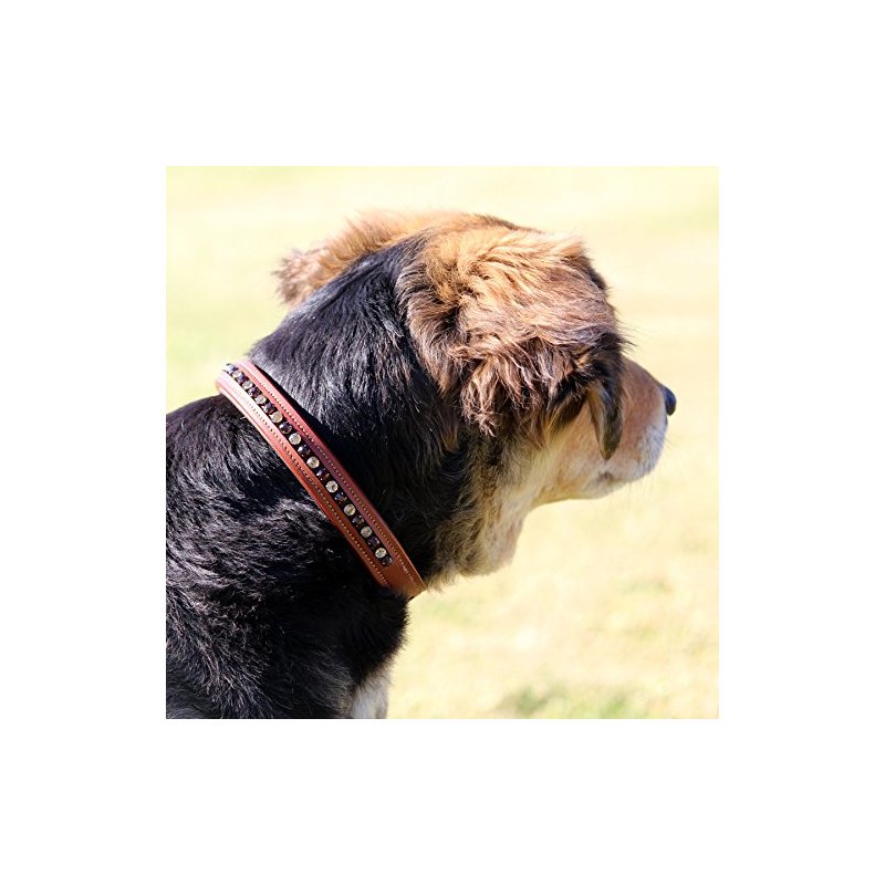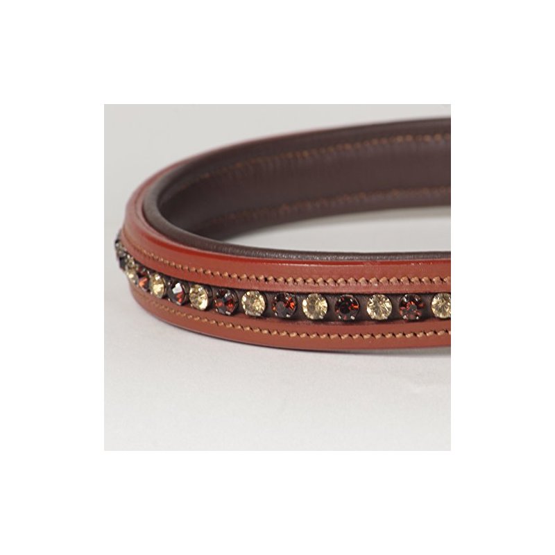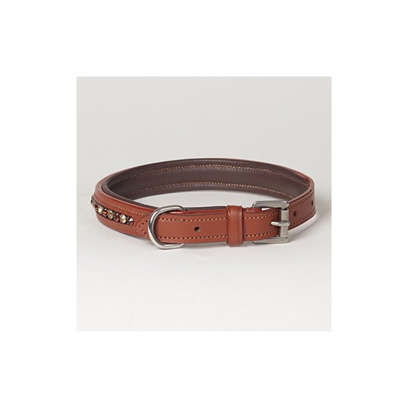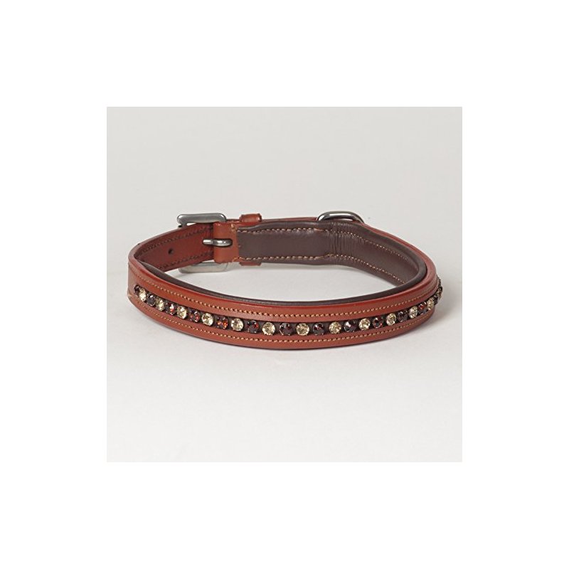 - This collar combines the beauty of genuine leather with color coordinated amber and gold colored rhinestones. Made with beautiful vegetable tanned Chestnut colored premium Buffalo leather; inner padding covered with super soft cow leather to ensure long lasting comfortable wear.