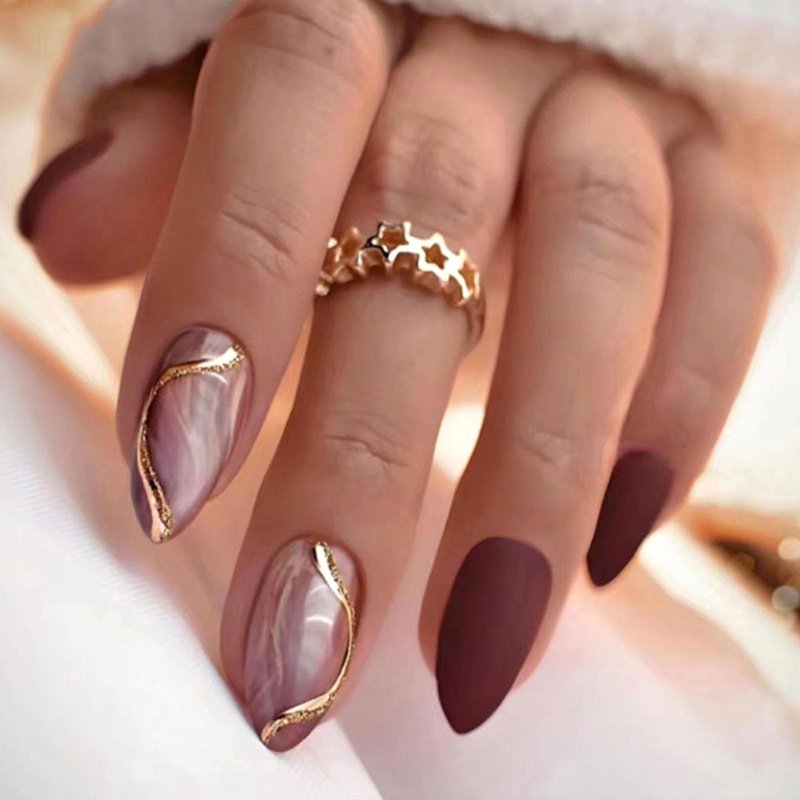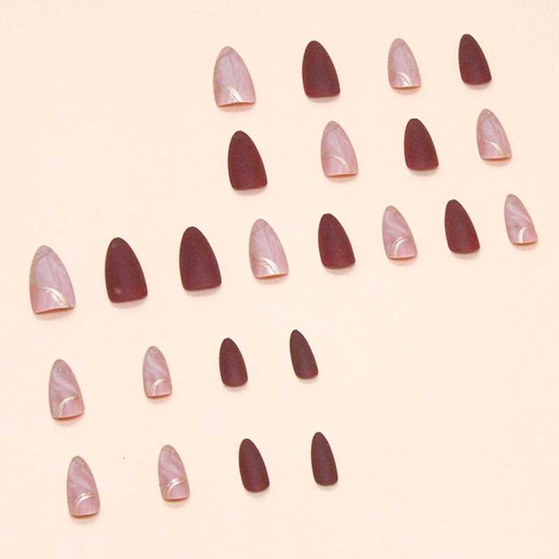 Medium Press on Nails Almond Fake Nails Burgundy Matte Full Cover Glue on Nails Golden Curve Glitter Design Acrylic Nails Press ons Glossy Artificial False Nails for Girls 24Pcs