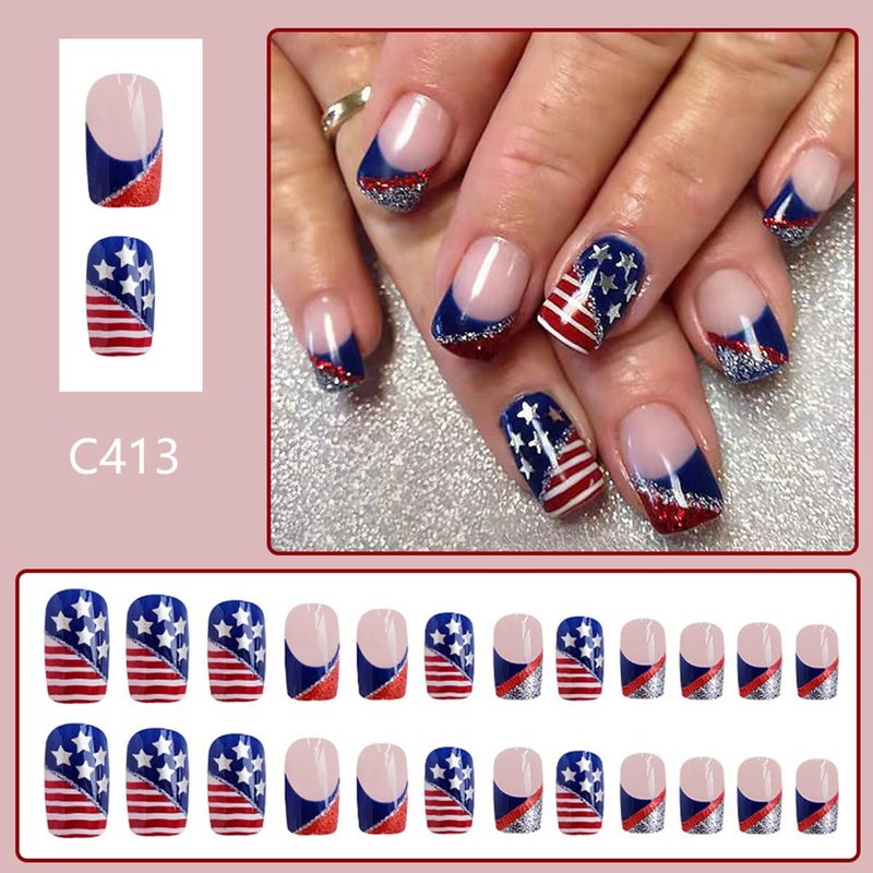 Medium Square Press on Nails French Tips Fake Nails Red and Blue Glitter Glue on Nails American Flag False Nails with Stars and Stripes Design Glossy Acrylic Stick on Nails for Women 24PCS