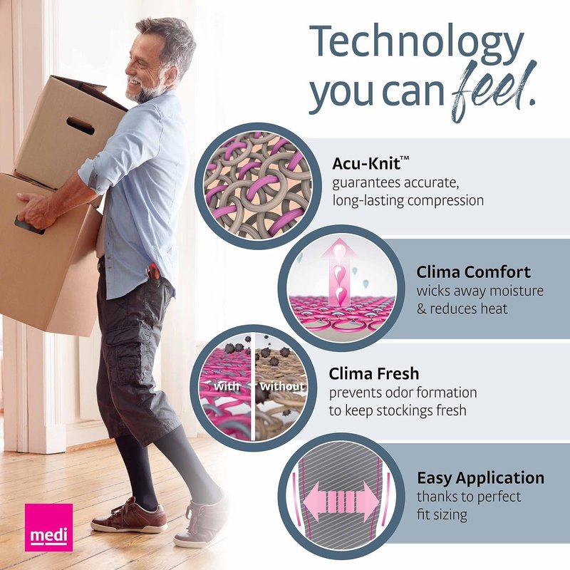 The reliable, all-around compression stocking for him and her. A mainstay of the mediven line for over 25 years, mediven plus for men & women offers the broadest range of ready-made sizes and styles in the industry today. This opaque fabric is pleasantly soft against the skin but due to its highly resistant stretch properties, mediven plus for men & women is specifically intended for the management of moderate to severe venous disease. The special features include opaque coverage to conceal blemishes and varicose veins, strong material for extra support, comfortable Clima Comfort material for temperature control, and Clima Fresh technology that inhibits growth and unpleasant odors.