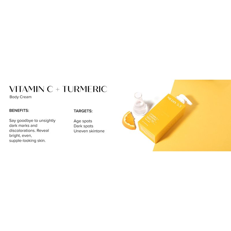 - RADIANT SKIN – This Medix 5.5 Vitamin C Body Cream infused with Turmeric helps refine the look of aging skin and uneven skin tone. Vitamin C helps promote an even skin tone, while also helping stimulate collection production to help improve skin elasticity + firmness. Advanced Brightening Vitamin C Body & Face Lotion helps refine the look of discolored skin, age spots, freckles, sun damage from sunspots, rough skin texture, hyperpigmentation, & acne-scars.