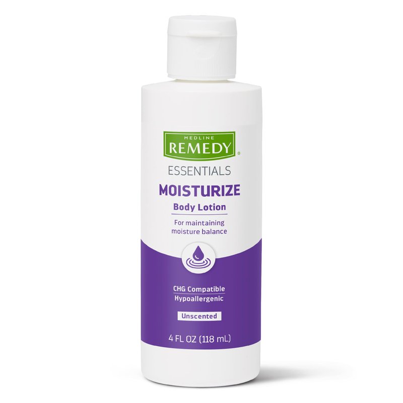 Medline Remedy Essentials Moisturizing Body Lotion (4 oz Bottle), Unscented, Hydrating, Non-Greasy, For Dry Skin, Hypoallergenic, Men, Women, Elderly