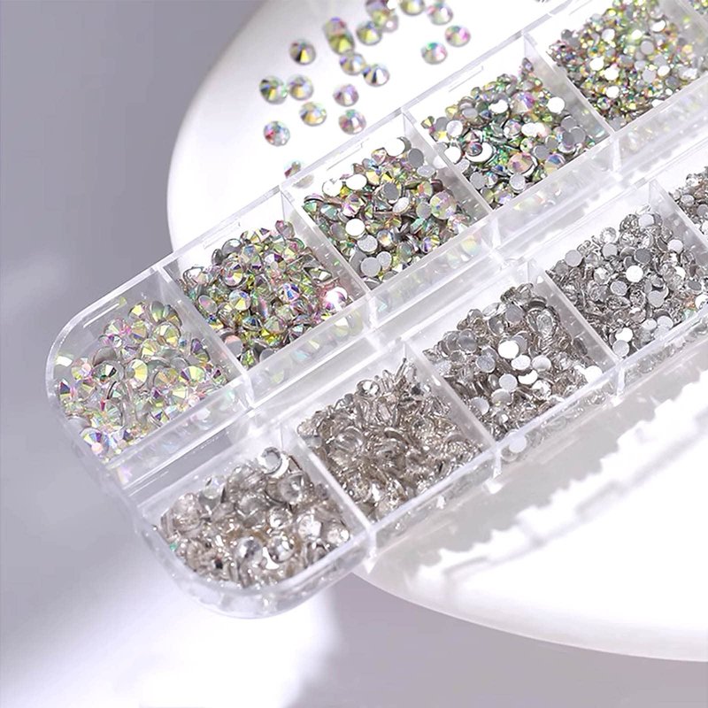 - Nail art gems set come in 2 different colors: iridescent and clear. There are 6 different sizes (Please refer to the picture for details), the storage box has 12 small compartments, and the lid can be opened separately for easy storage.