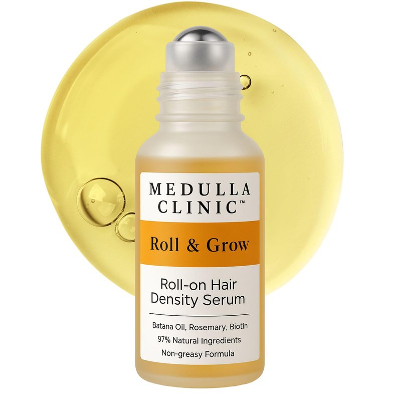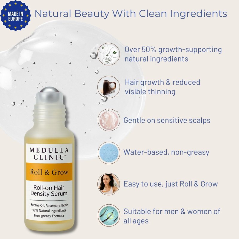 Medulla Clinic Roll & Grow Hair Growth Serum Roll On is a clean, science-backed scalp treatment developed through years of research to support healthier, fuller-looking hair for both men and women of all ages. With over 50% active growth ingredients and more than 9 scientifically recognized actives, including Batana Oil, Rosemary Water, Caffeine and Biotin, this roll-on hair serum targets the root of thinning by nourishing the scalp, stimulating follicles and reinforcing hair structure. Batana Oil is prized for its regenerative properties, Rosemary boosts circulation to awaken follicles, Caffeine energizes roots and helps prolong the growth phase, while Biotin supports keratin production for stronger strands. Complemented by Soy and Wheat proteins, Green Tea and Peppermint, this formula works in synergy to reduce thinning and support natural hair growth. Easy to use, simply apply the Medulla Clinic Roll & Grow Hair Growth Serum Roll On directly to the scalp 2-3 times per week, or more frequently as part of your daily routine, and massage gently with your fingertips – no rinsing required. The lightweight, non-greasy texture absorbs quickly and is convenient at home or on the go. Results may vary, but with consistent use visible improvements in fullness and density are typically noticed within 3-6 months. Dermatologically tested, vegan-friendly and free from parabens, sulfates, alcohol and synthetic fragrance, the Medulla Clinic Roll & Grow Hair Growth Serum Roll On is gentle even for sensitive scalps, with a natural herbal scent from rosemary and peppermint. A safe, effective and travel-friendly way to restore confidence in your hair and boost your daily routine.