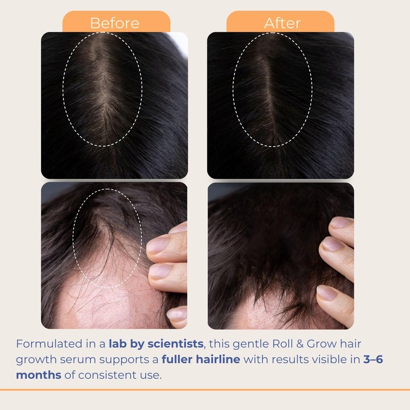 - Visible Results in 3-6 Months. With consistent use at least 2-3 times per week and gentle scalp massage, the Roll & Grow Hair Growth Serum Roll On helps reduce thinning and support natural hair growth, gradually improving hairline fullness and overall density. Also, designed to complement derma roller and microneedling scalp care routines. Over time, it supports stronger, healthier-looking hair and helps restore confidence in your appearance.
