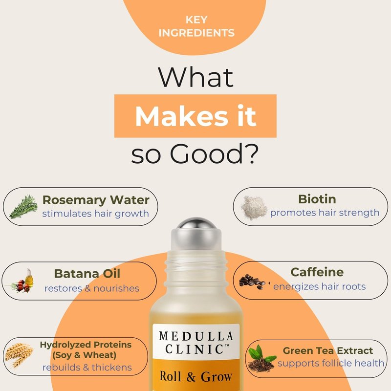 - Over 50% Active Growth Ingredients. Developed through years of research, the Roll & Grow Hair Growth Serum Roll On is enriched with more than 9 scientifically recognized actives, including Rosemary Water, Caffeine, Biotin and Batana Oil. Trusted by thousands of customers worldwide, it helps nourish the scalp and promote fuller, stronger and healthier-looking hair for both women and men of all hair types and ages.
