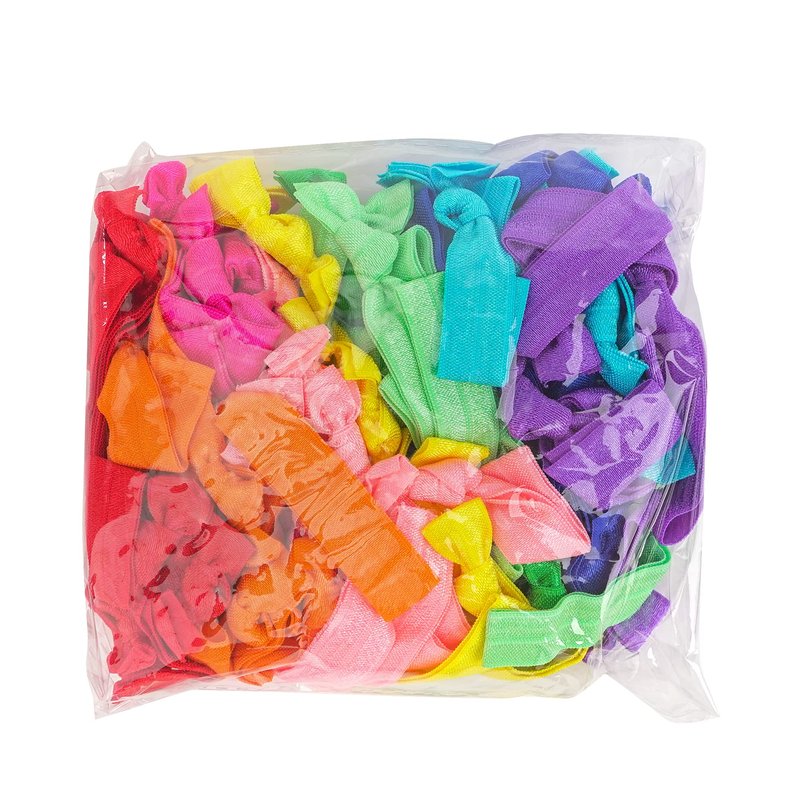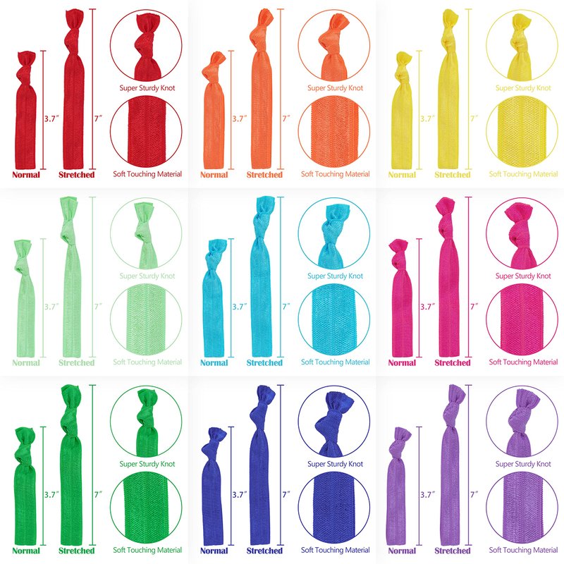 - 🌈 Our rainbow package contains 100 pack solid hair ties, 10 different colors with 10 pack of each red, orange, pink, hot pink, mint, green, blue, royal, purple and yellow color. Our hair ties are made of very soft fold over elastics with a satin look finish. Each hair tie measures approximately 3.7 inches in length (including the knot), when laid flat, allowing you to store an unused band comfortably on your wrist.