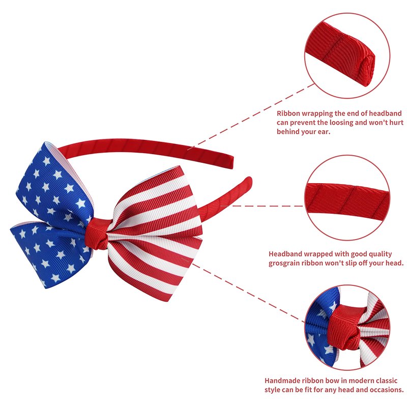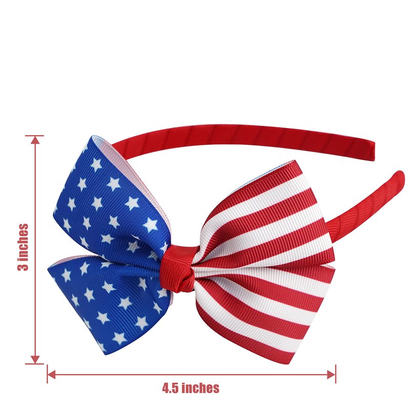 - πΊπΈ This pretty headwear is designed with red headband and the bow is proudly printed with the stars and stripes for a one-of-a-kind patriotic look. Comfortable and easy to put on, it comes in bright colors that adapt to various occasions, Fourth of July, independence day party or anytime you need a patriotic boost. Also the perfect accessory to your patriotic outfit! Highlight your appearance and grasp everyone's eyes in the crowd. You can enjoy it anytime and anywhere, fit for any ages!