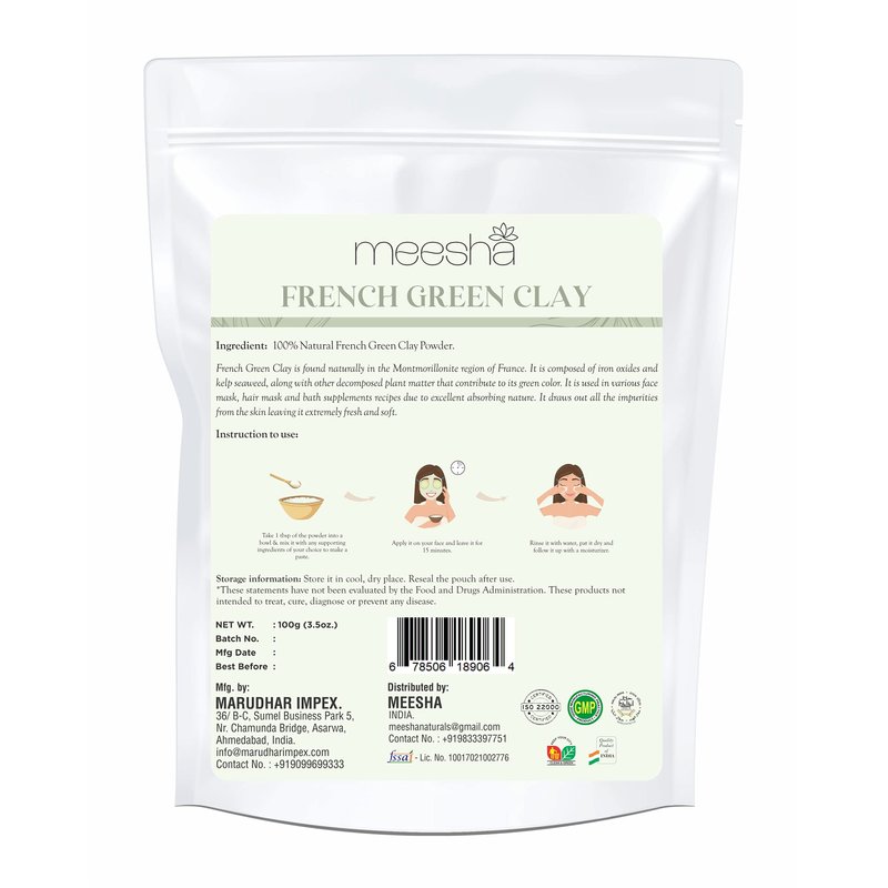 meesha French Green Clay Powder Montmorillonite Clay | 3.5 oz (100g) | Detoxifying, cleansing clay | Suitable for all skin types| Face masks | Soap making, Body scrubs, Bath bombs |100% Natural