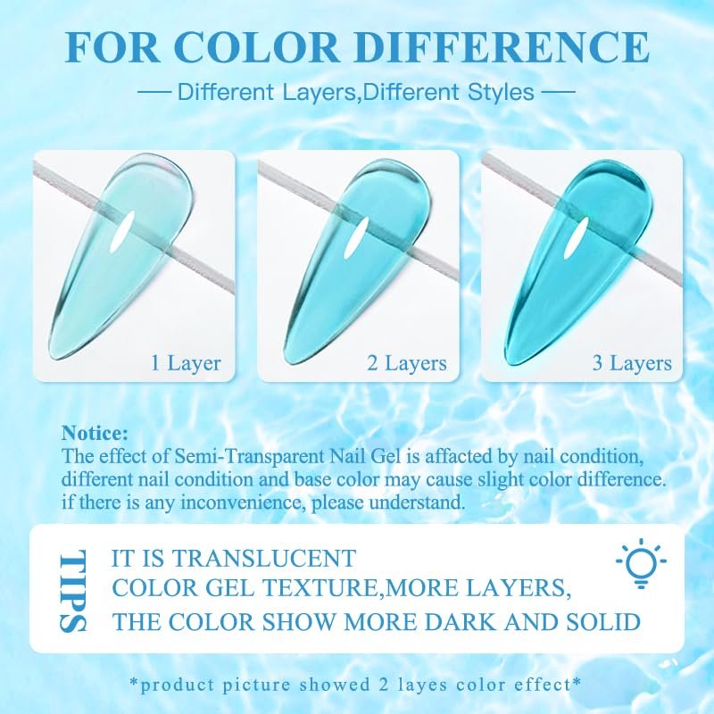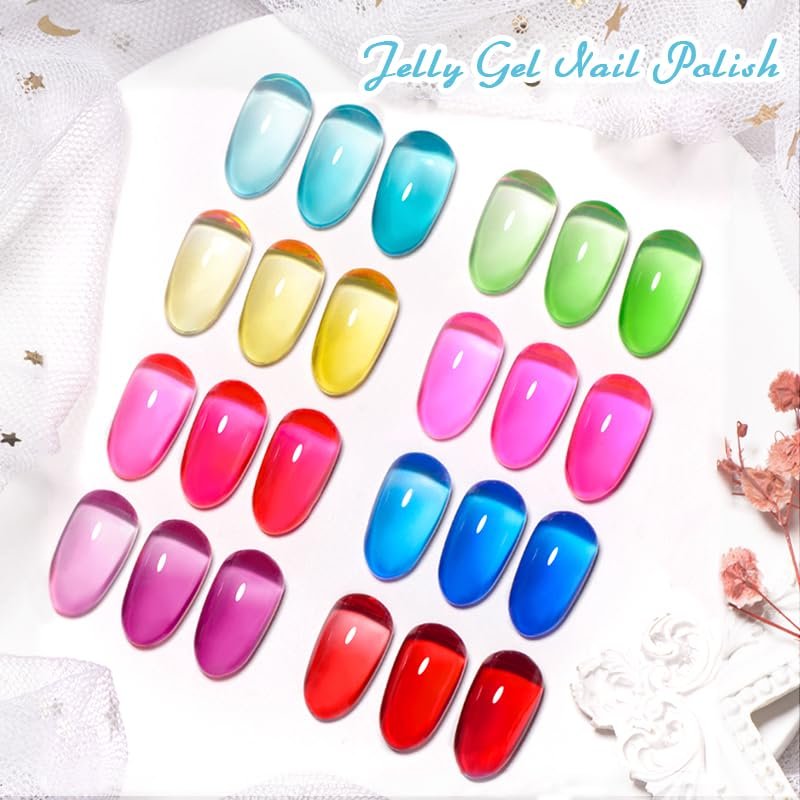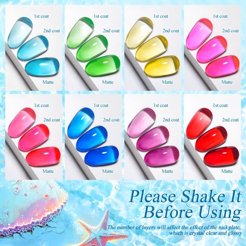 - Jelly Gel Polish Kit : Nail trend color, 8 colors glaze glass nails elegant shades suitable for all seasons and daily routine life! Neon bright colors are forever young and timeless!