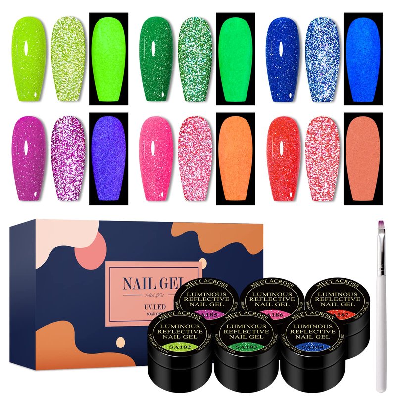 - ✔ Shiny Disco Gel Nail Polish: When you go to Bars, Parties, Halloween Celebrations, MEET ACROSS neon reflective gel nail polish set is so perfectly suitable for you to be the centre of any party. The glow gel polish can make you the most charming one in the crowd.