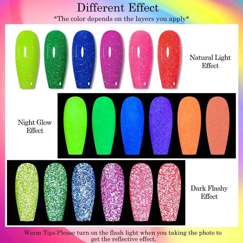 - ✔ What You Will Get: You will get 6 colors luminous reflective gel nail polish, they can not only glow in the dark but also reflect better under the strong flashlight, you will be amazed by these effects. But it can not glow in the dark continuously, only when the gel polish absorbs enough light the glow will last longer.
