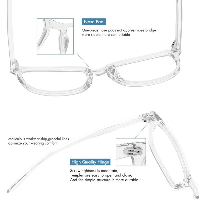 --Clear lens -- The transparent lens ,without adding any pigment, while maintaining high light transmittance. Less reflective, no affect reading, and almost no color difference.