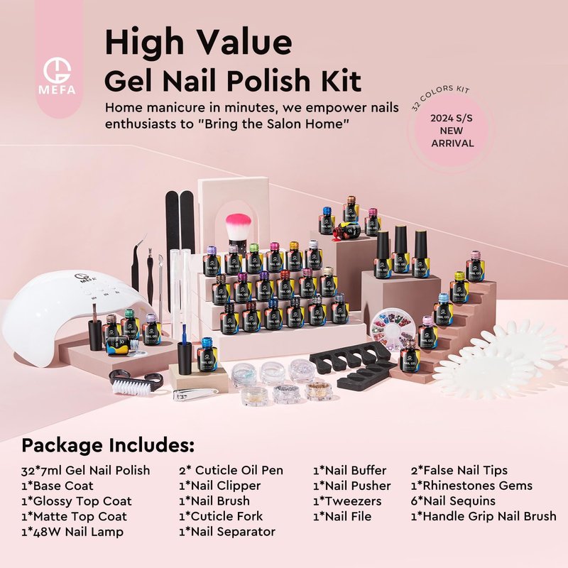 MEFA 56 Pcs Gel Nail Polish Kit with U V Light, 32 Colors All Seasons Soak Off Gel Polish Nail Set with Matte/Glossy Base Top Coat Essential Manicure Tools Nails Art DIY Gifts