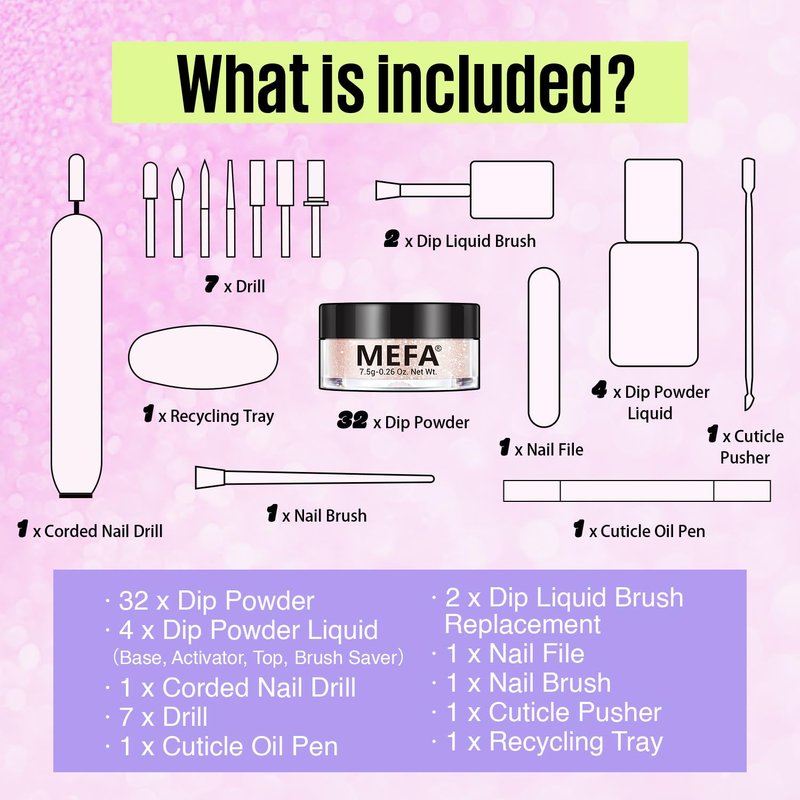 - ✅【Healthy & Upgraded Ingredient】MEFA dipping powder is crafted from gentle, non-irritating ingredients, featuring a unique and healthy formula enriched with calcium and vitamins. It's free from parabens and cruelty, ensuring safety, harmlessness, and odorlessness. It won't harm your nail bed and can be air-dried. The upgraded formula used, ultra-fine powder, a perfect blend with glue, no bubbles, and high color, better show the charm of fingertips. However, it's recommended to refrain from prolonged skin contact.