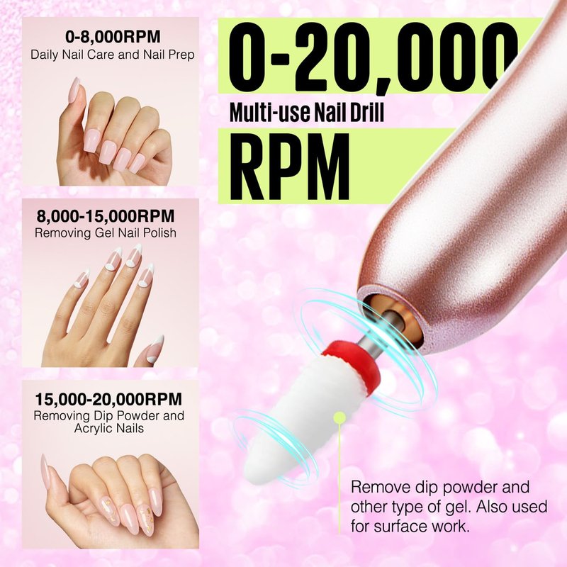 - ⏱【Adjustable Speed & Direction Nail Drill】This nail drill features adjustable speed (0-20,000rpm) and forward/reverse control for easy use with one button. It's great for professionals and beginners. With 7 drill bits, it handles cuticle removal, polishing, grinding, and removing gel, dip powder, and acrylic nails, saving time.