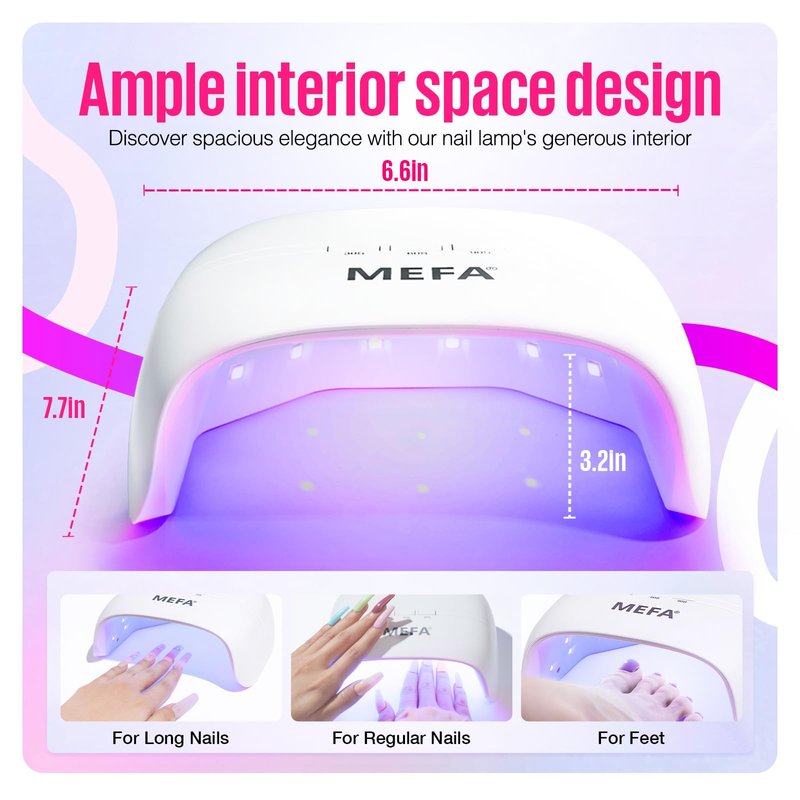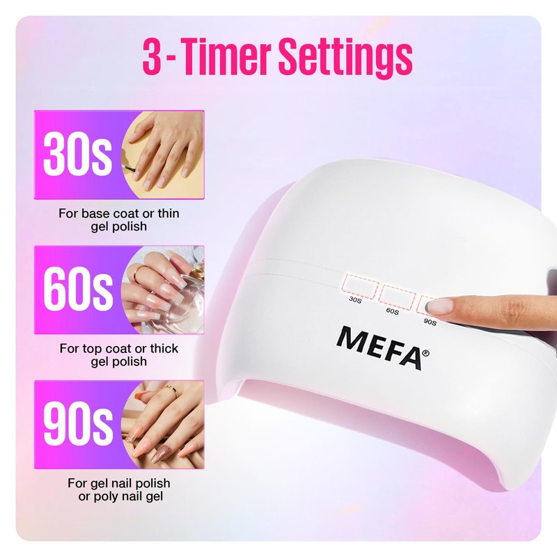 - Safe Intelligent & Easy to Use: MEFA’s smart sensor allows automated curing process to start without manual operations. It is adjustable in 3 timer settings of 30s/60s/90s. This uv nail lamp is ideal for professional manicurists and novices to use