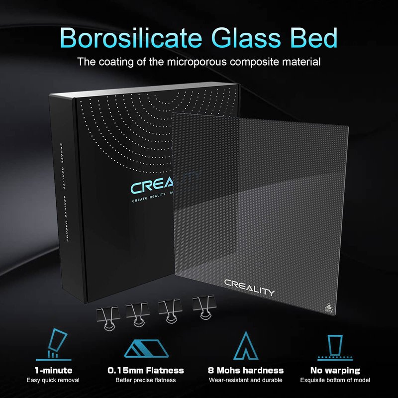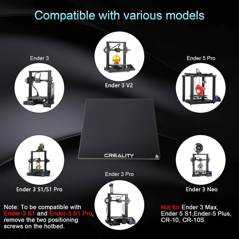 - Compatibility: Officially authorized Creality glass bed, applicable for Creality 3D printers Ender 3, Ender 3 Pro, Ender 3 V2, Ender 3 Neo, Ender 3 V2 Neo, Ender-5, CR-20, CR-20 Pro, other 3D printers with a print area of 220*220mm(note for Ender 5 S1) and most of the Cartesian style 3D printers with an MK2 MK3 hotbed. Please make sure the printing size of your printer's platform is compatible. and to be compatible with Ender-3 S1/Ender-3 S1 Pro, please remove the two positioning screws on the hotbed first.
