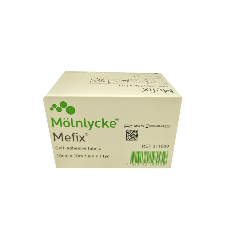 Mefix Self-Adhesive Fabric Tape. Width: 4" (10cm), Quantity: 1 Roll Porous, nonwoven fabric ensures air and water vapor permeability. Stretchable fabric conforms well to body contours and allows unrestricted movement. Non-absorbent to prevent blood and fluid strike-through. Provides secure fixation, while remaining gentle on the skin. Release paper is premeasured in 4' (10cm) intervals and has a perforated split backing for easy removal and application. Can easily be cut to the desired shape. Recommended for fixation of dressings, catheters and cannulas, especially on the neck, elbow and knee. In 11 yd. (10m) rolls. Latex free. Product photo may not exactly match the product offered for sale. Please refer to the product description.