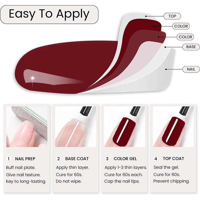 - SPEED CURING with UV NAIL LAMP: Burgundy Red gel polish need to be cured under UV/LED light. Base and Top coat required. Average for UV/LED light 60-120 secs.