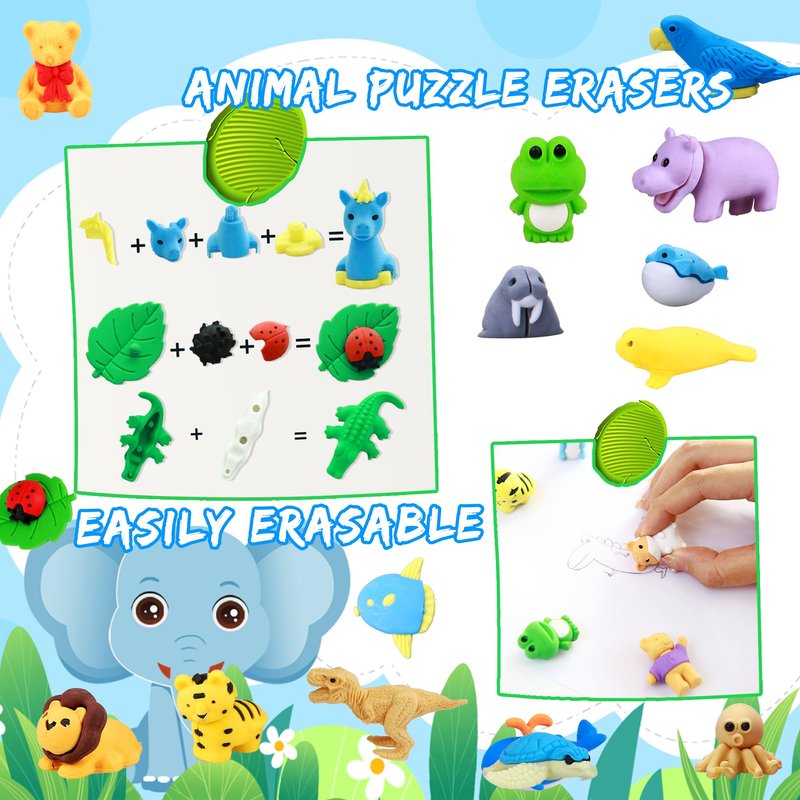 - Puzzle 3D Cute Erasers: 58 Pcs creative 3D animal desktop erasers are lifelike and cute! Each eraser is special designed to look like a real critter on paper, adding infinite fun and vitality to your child's desk