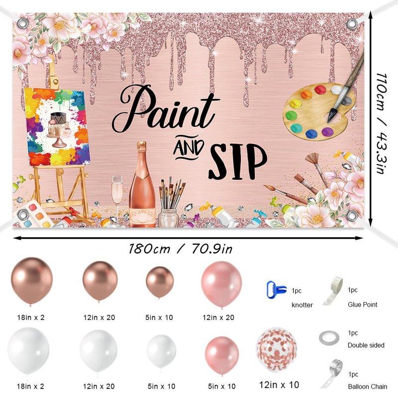 - What you’ll get: The Sip and Paint Happy Birthday Party Decorations including a Paint and Sip banner(180x110cm). 70 x latex balloons 12 inches (rose goldpearl whitepearl rose gold ransparent rose gold sequin balloon). 4 x latex balloons 18 inches (rose goldpearl white). 30 x latex balloons 5 inches (rose goldpearl whitepearl rose gold). 2 x champagne foil balloons. 1 x balloon strip, 1x Balloon Knotter, 1x Backdrop ribbon and 1 roll of adhesive dots, great for your night party