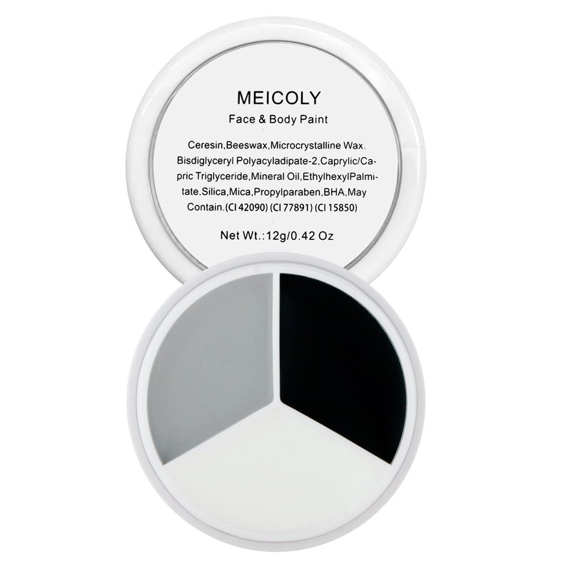 - Halloween Clown SFX Cosplay Makeup Palette:MEICOLY face body paint palette includes 3 different colors,you will get black face paint,white face paint and light grey face paint,meet your need for doing many kinds of Halloween cosplay makeup or stage performance