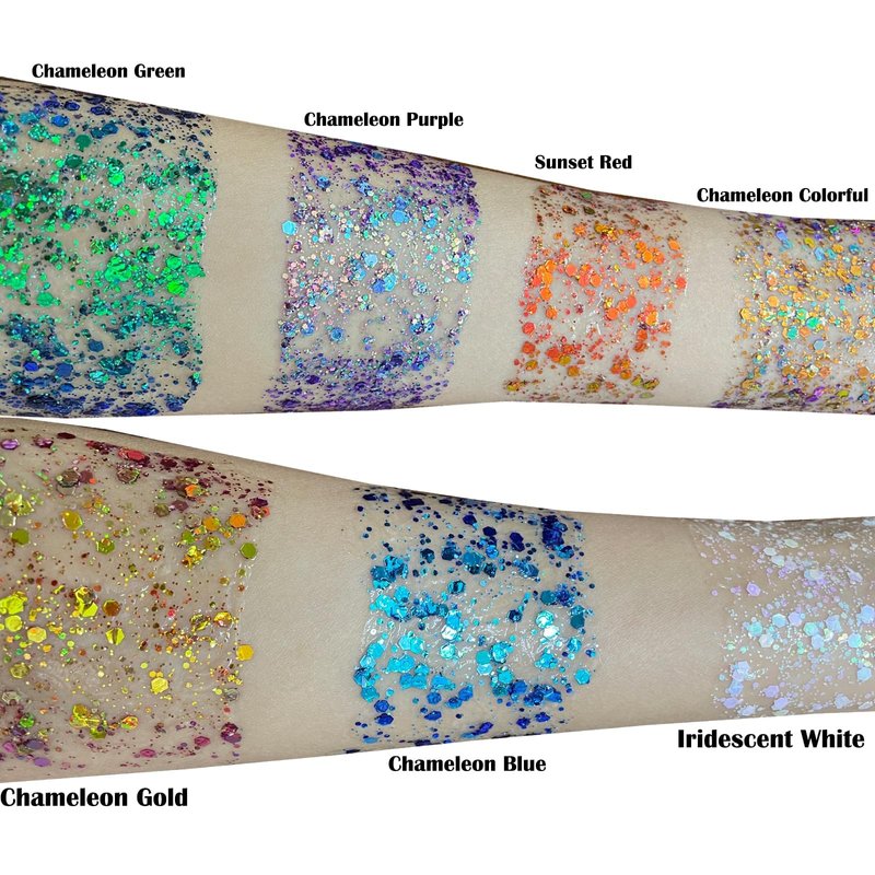 - Easy to Apply and Long Lasting:MEICOLY chameleon face glitter gel sticks to the skin very easily,it goes on smooth and dries quickly without becoming flakey,stays on well and hold up all day with bright and shiny effect