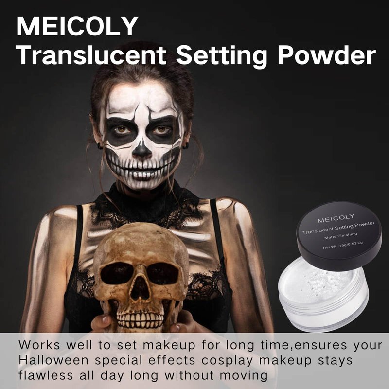MEICOLY Setting Powder with Sifter,Long Lasting Loose Face Powder,Translucent Powder Colorset Powder,Matte Finishing White Face Paint Setting Powder for Halloween SFX Cosplay Makeup,Oil Control
