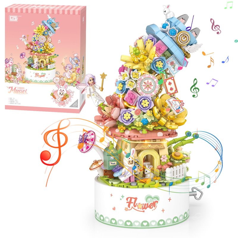 MEIEST Falls Building Blocks Rotating Music Box Set,Candy Flower Bonsai Botanical Collection with Light,Home Decor (Flower)