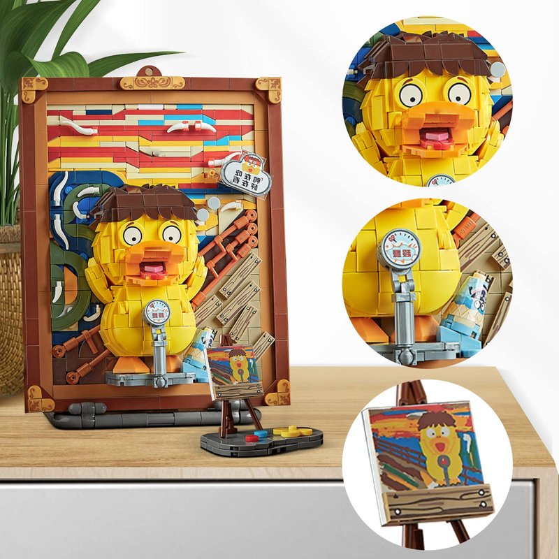- NEW DESIGN : Stereograph Building Kit----A three-dimensional cute The Scream picture made of small building blocks.Each element of the Stereoscopic picture is displayed in a miniature building block model--A duck screaming because of its overweight.There is also a painter who is painting at the scene.Recreate a The Scream Duck painting with building bricks. The latest design make your life full of Lovely artistic atmosphere.The product is mini size about 25% smaller than standard brick.