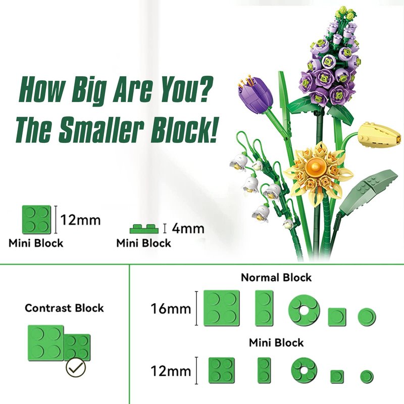- Creative Decoration : Making the building kit set as a display for your office, book self, desk and room. Place the Artificial flower bouquet Model anywhere you like. Mini Bricks Model bricks Mode is mini size smaller than standard brick, but the detail are complete, rich in structure.