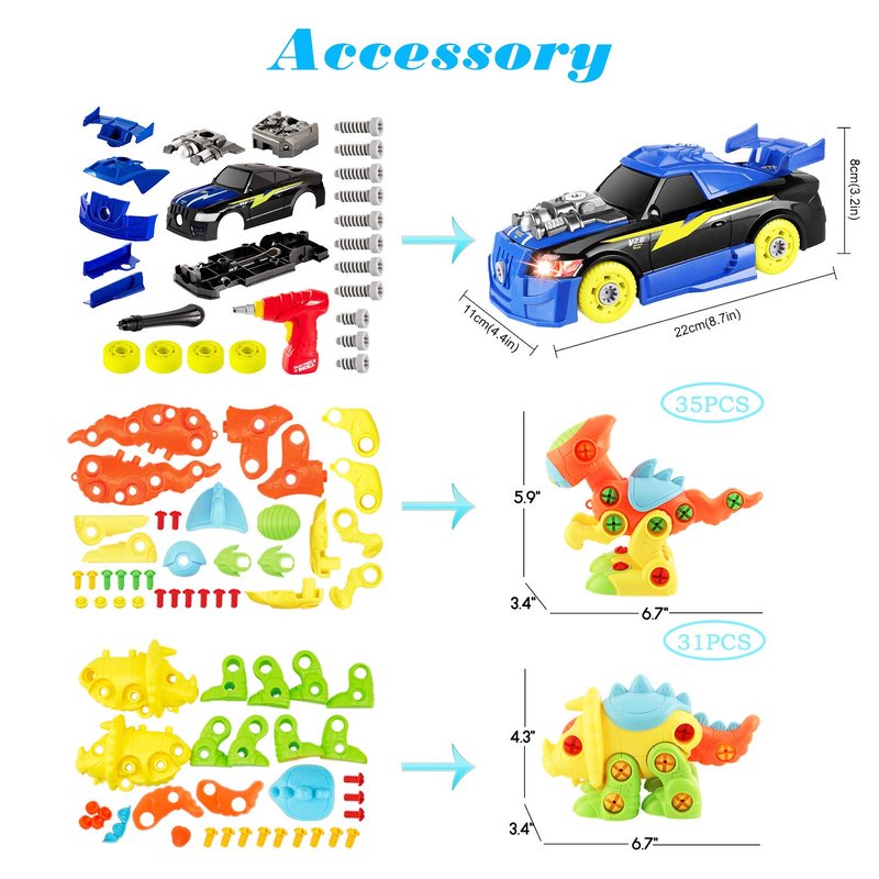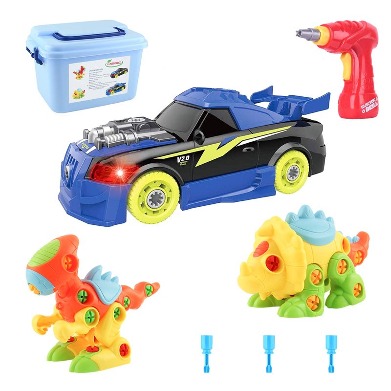 - Educational Playset - 2*Take Apart Dinosaurs, 1*Take Apart Car. Extra 6*Screws, 3*Screwdrivers, 1*Power Drill, 1*Instruction Booklet, 1*Storage Box. The Dinosaur Kit comes fully assembled so kids can open the box and start playing immediately