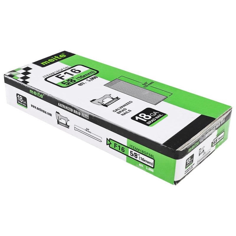 [About meite] Established in 1986, Guangdong Meite Mechanical Co. Ltd. is a leading company in professional pneumatic nailers & staplers, pneumatic tools, and accessories, etc. in China. Meite products are widely used in the furniture manufacturing industry, home furnishing industry, construction industry, packaging industry, home appliance industry, automobile industry, animal husbandry, etc. It is the original intention to obtain customer satisfaction with excellent product quality and performance. [Product Description] Full Length: 5/8" (16 mm); Quantity: 5,000 Counts per Box, 28 Boxes per Case/Carton; Finishing: Galvanized (with Sharp Chisel Point); Compatible Tools: meite F32 pneumatic brad nailer and other brands of 18 gauge straight brad nailers with the same nail range; meite 18 gauge 5/8-inch length galvanized straight brad nails have a smooth surface, can be easily concealed if desired, and are durable for interior uses. Available from lengths of 1/2"-2" (12-50 mm) providing flexibility for different types of projects. [Application] Widely used in molding, crafts, woodworking, window trim, baseboard, picture frame assembly, cabinetry, and many other wooden projects [Sharp Chisel Point] Designed to drive the nails/staples into objects with fewer jams, buckles, and interruptions. Easily and quickly penetrate through many different materials with no deformation.