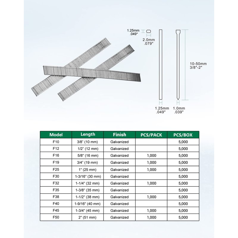 - [Compatibility] Compatible with meite F32, F50G pneumatic brad nailers and other brands of brad nailers with the same nail range (Please verify the compatibility before ordering.)