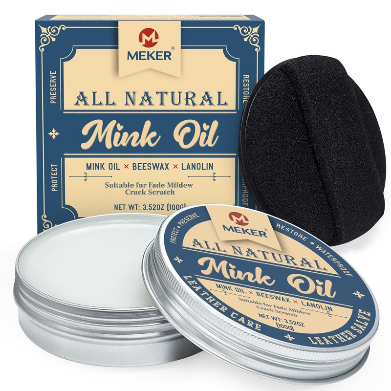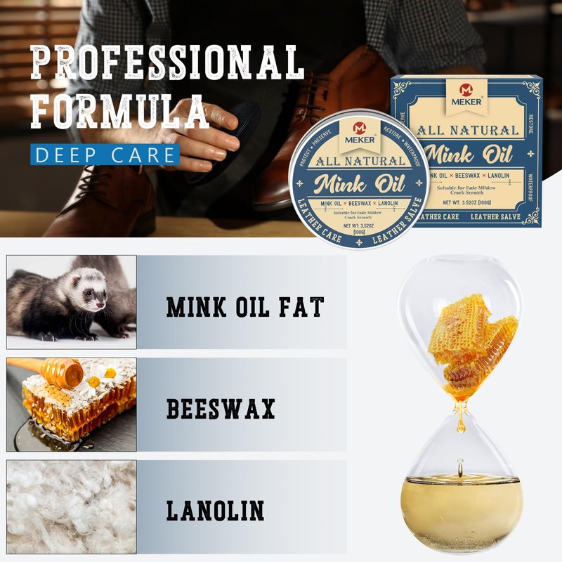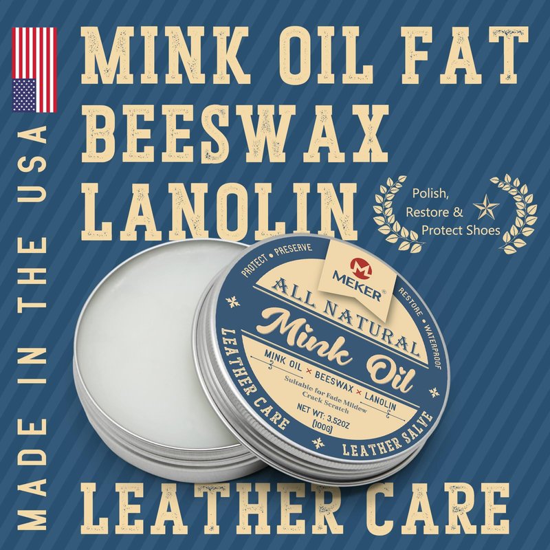 - Natural Formula: Revitalize and protect your leather shoes, boots, couches, jackets and more with MEKER Mink Oil. Made with the best premium ingredients including MINK OIL FAT(15%), BEESWAX(15%) ,LANOLIN(5%), MAINTENANCE OIL(40%) & FATLIQUOR(25%). Ensuring safe and non-toxic care for your leather products.