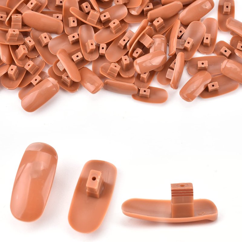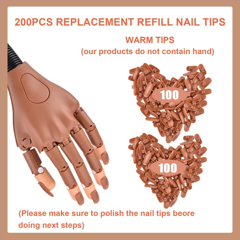 Replacement Nail Tips DescriptionComes 200 Pieces MEKK false replacement refill nail tips for the practice hand. Suitable for nail art beginners, professional nail salons and DIY at home.Features1.Easy to use:It's easy to take off and refill the nail tips, and surely it will not fall off easily.2.High-quality Material: These false nail tips are made of high quality of ABS material, no smell, sturdy and durable, healthy and safe.3.Cycle Use:Our practice nail tips can be used repeatedly. You can remove the nail polish after use and put it in a dry place to store. SpecificationsQuantity:200PCS replacement nail tipsMaterial: high quality of ABS Color: only brown nail tips