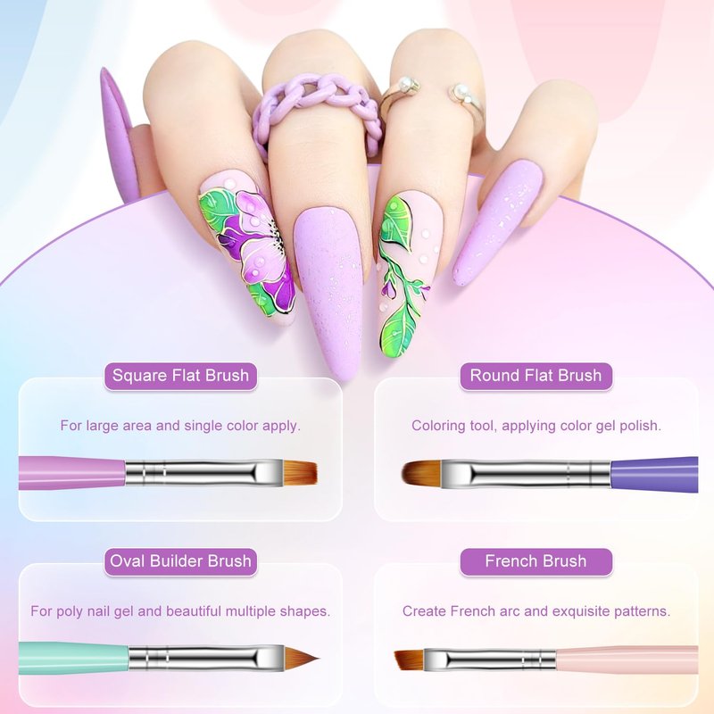 Features of MEKK Brushes SetColor:Multicolor.Use: Nail art brushes. 6pcs: short liner brush and dotting pen, round flat brush and dotting pen, square flat brush, oval builder brush, french nail art brush, long liner brush.Application1.Soak brush in the warm water to remove the wax layer, then wipe the excess with wipes. 2.After curing the gel polish, using the liner brush to create the lines you want. 3.Apply proper top coat, then cure 90s-120s. 4.Using cleaner solution to clean the brush, then store it in the corresponding tubes. Short Liner Brush and Dotting Pen1.Nail art helper, making delicate pattern and easy to dot.Round Flat Brush and Dotting Pen2.Coloring tool, for applying color gel polish and easy dotting.Square Flat Brush3.For large area to spply, base&top coat or single color apply. Oval Builder Brush4.Work well with poly nail gel and make beautiful multiple shapes.French Nail Art Brush5.Perfect to create French arc andfor drawing straight lines filling.Long Liner Brush6.Thin line maker, perfect to draw long lines and smooth swirling.