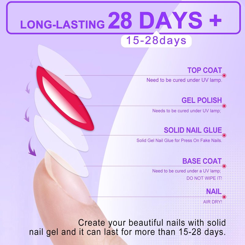 - ❤【Long-Lasting & Strong Adhesion】After cleaning your nails and applying the base coat, then apply this solid nail glue, after adjusting the effect you want, it will cure under the nail lamp for at least 60 seconds, after curing under the nail lamp, it has a stronger adhesion than the liquid glue, because of the thick texture, even if it is not dry, you can still use it normally, with the correct use of the method, it can make your manicure effect last for at least 14 days.