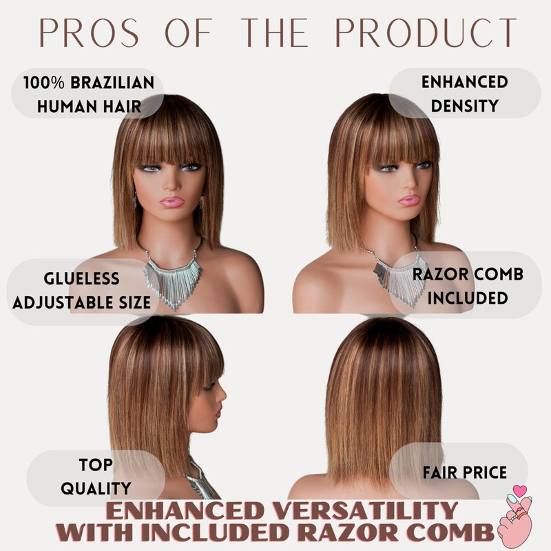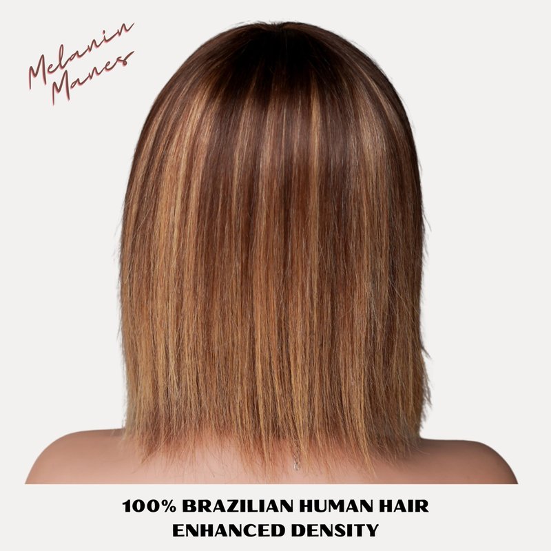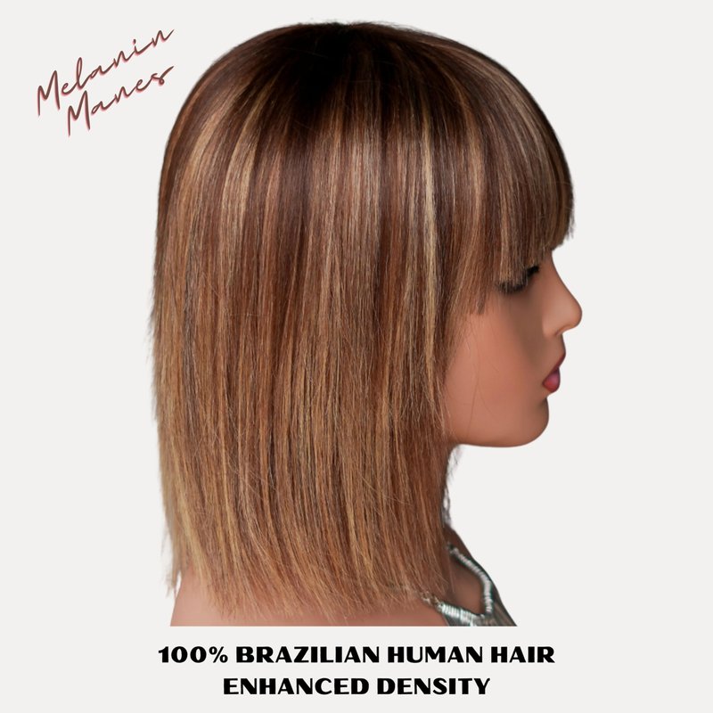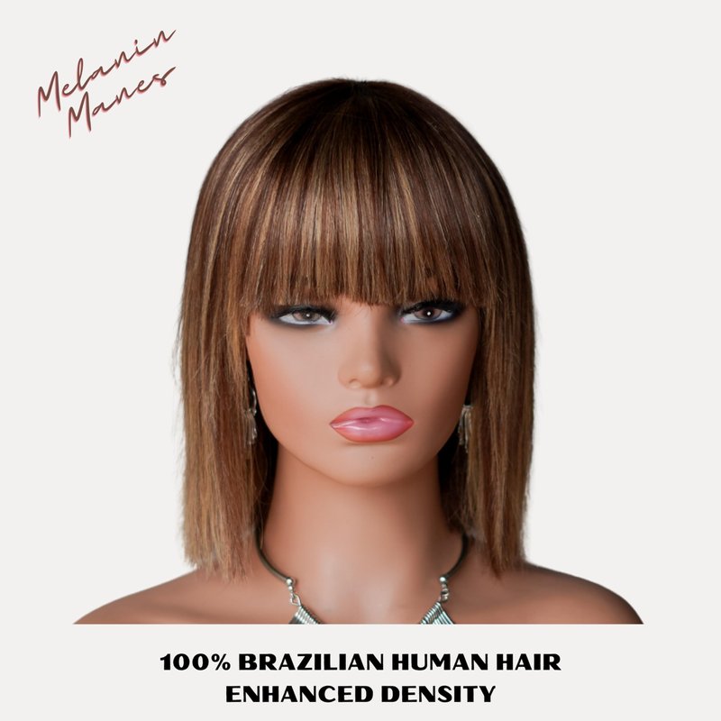 Melanin Manes Short Bob Wig With Bangs 100% Brazilian Human Hair Straight 10 Inch Ombre Brown With Blonde Highlights 4/27 180% Density Glueless Machine Made With Razor Comb With Wig Cap