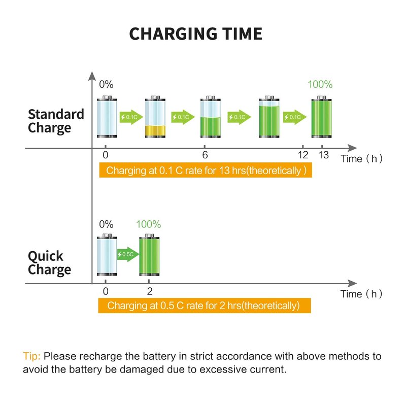 - Charging Method: Charge at 0.1C rate for 10 hours, or charge at 0.5C rate for 2 hours. Note: Please charge the battery in strict accordance with above methods to avoid damage caused by excessive current during charging. And do not reverse the positive/ negative of the battery.