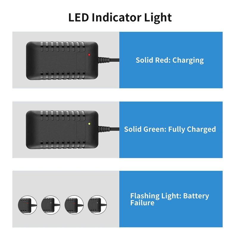 - Intuitive Charge Indicator: LED light on the charger stays in Red during charging process and turns Green when battery is fully charged. Flashing red indicates that there is a bad connection. Lights off means charger is defective, replace needed..