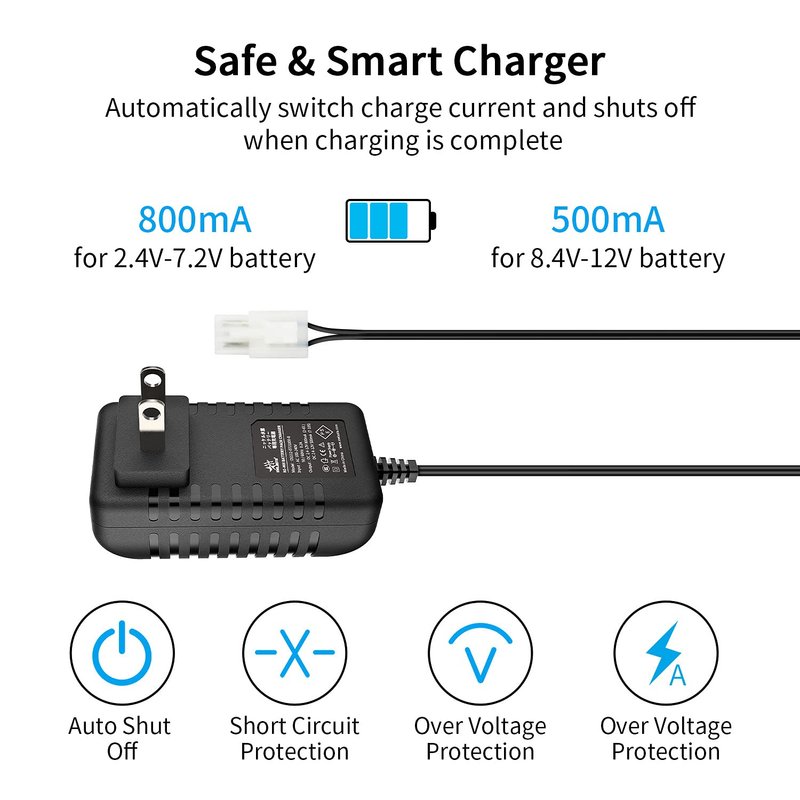 - Smart Trickle Charger: Automatically detects the voltage of your battery and shuts off when battery is fully charged in order to avoid over-charge. Charges at a 800mA for 2.4V-7.2V battery or 500mA for 8.4V-9.6V battery. Typical charging time is 6-10 hours depends on battery capacity.
