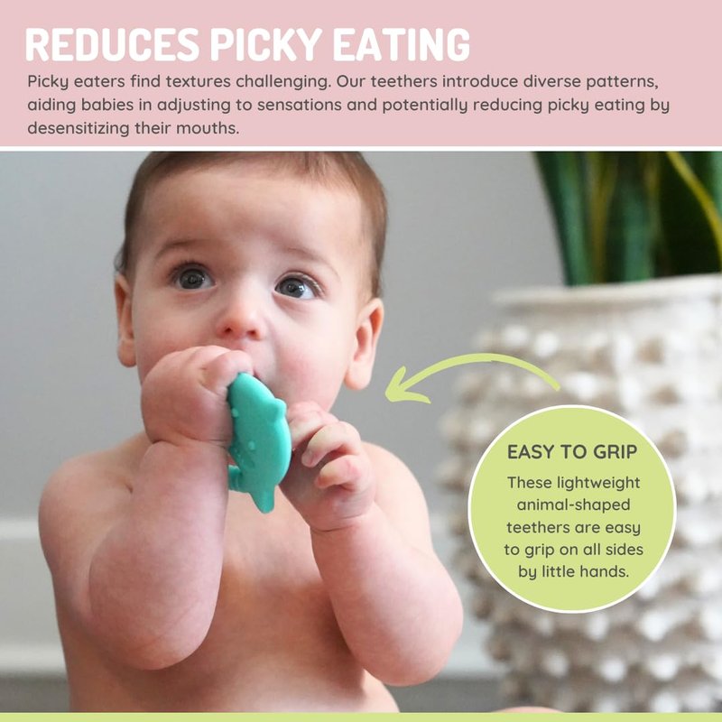 - TEXTURED TEETHERS CAN REDUCE PICKY EATING: Many picky eaters have a hard time eating certain textures. Our teethers have various patterns, grooves and bumps which help your baby get used to new and different textures in their mouth. This can reduce picky eating as the teethers help desensitize your baby’s mouth.