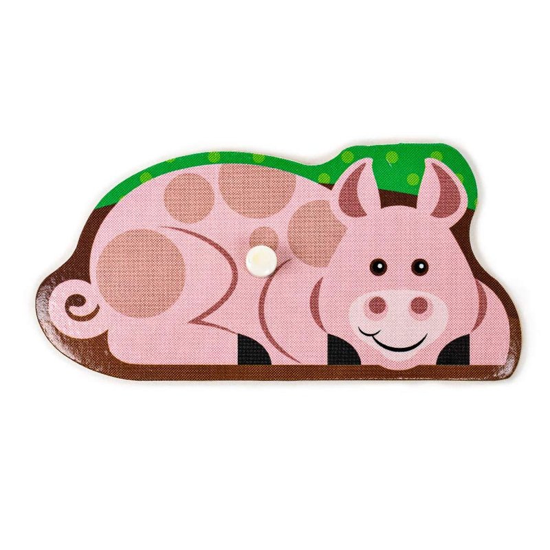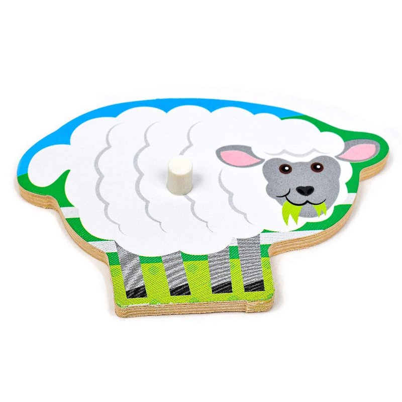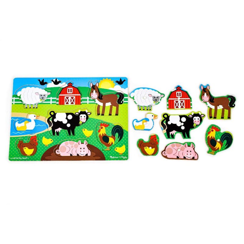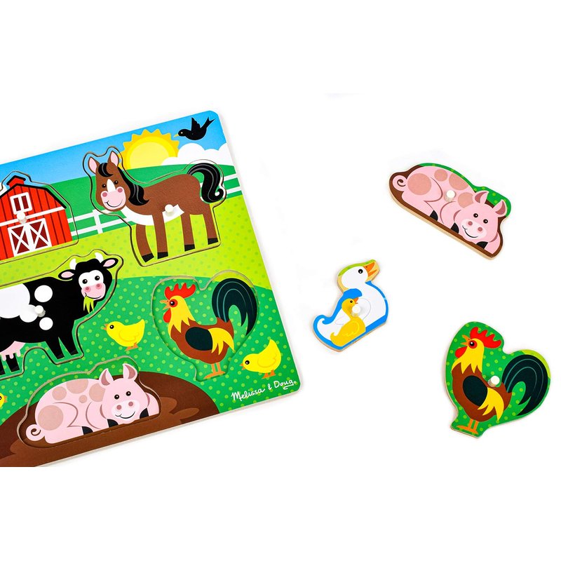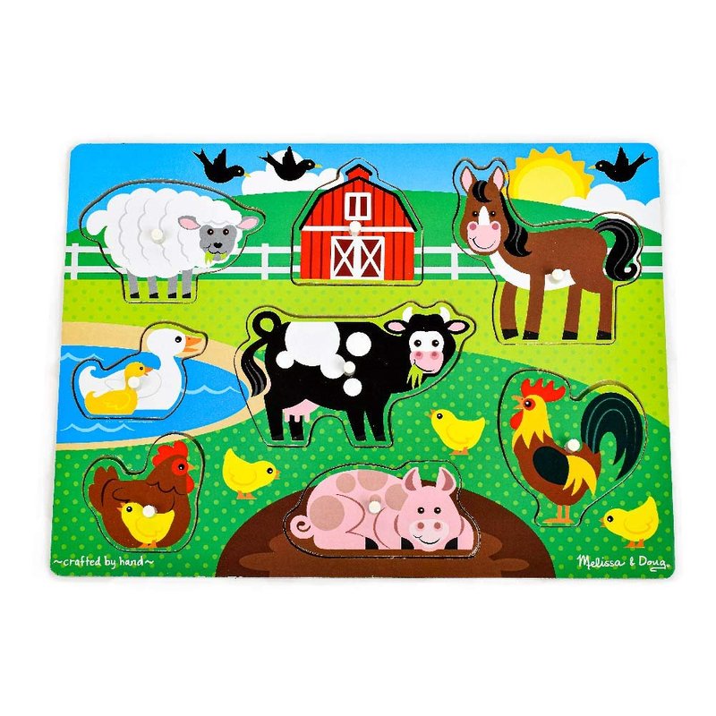 - Farm Wooden Peg Puzzle: This wooden 8-piece peg puzzle is decorated with a charming farmyard scene and the pictures under the puzzle pieces make it simple and lots of fun to place the barn and animals into shaped wells