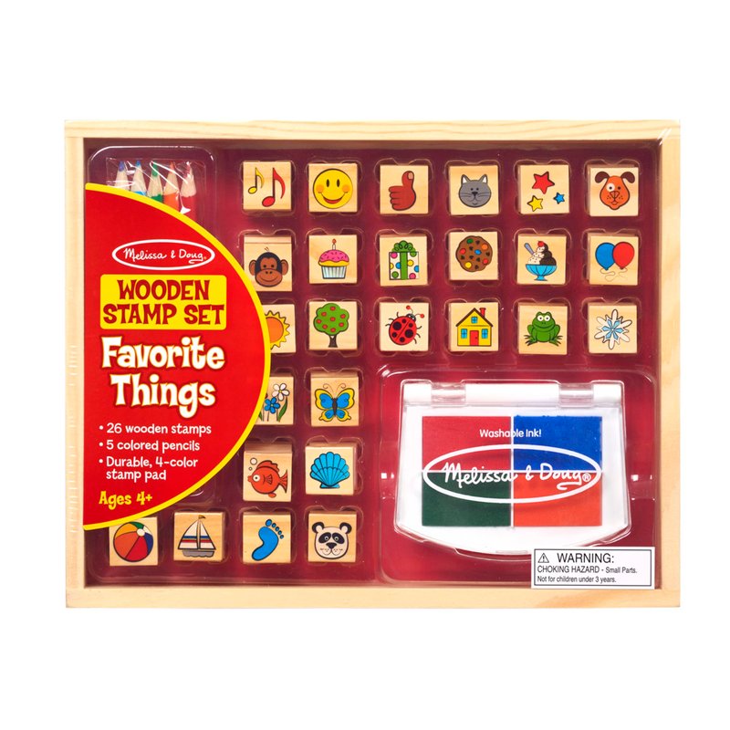 Melissa & Doug Wooden Stamp Set, Favorite Things - 26 Stamps, 4-Color Stamp Pad With Washable Ink For Art Projects For Kids Ages 4+