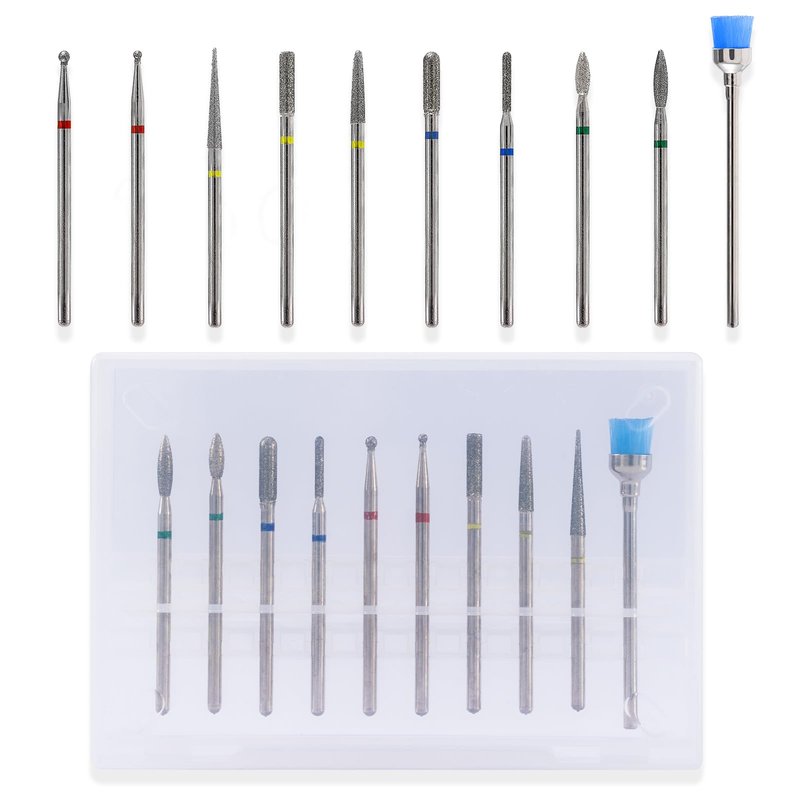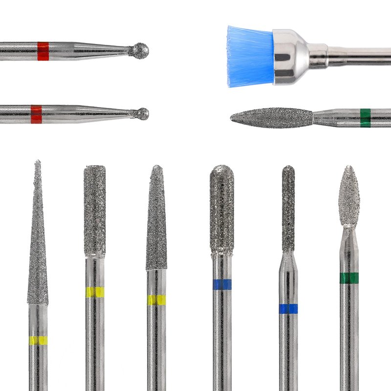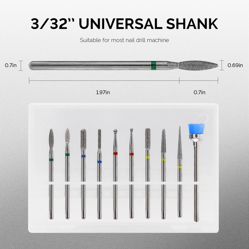 - All in One Nail Drill Bits Set: Made of premium diamond metal, this nail bits kit is strong enough for filing, drilling, and removing acrylic nails nature nails. 10Pcs different shapes and sizes bits design, meet your diversified needs, allowing you to prepare the nail bed, clean the cuticle area, shape and shorten the nail, smoothly remove on the surface, drill nail holes, and so on.