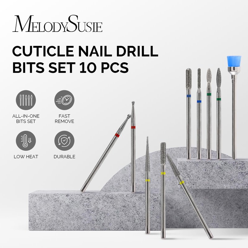 MelodySusie 10pcs Nail Drill Bits Set, 3/32 Inch Diamond Cuticle Nail Bits Kit for Nail Drill E-File, Manicure Pedicure Remover Tools for Acrylic Gel Nails, Salon Home Nail Care Supplies, Silver