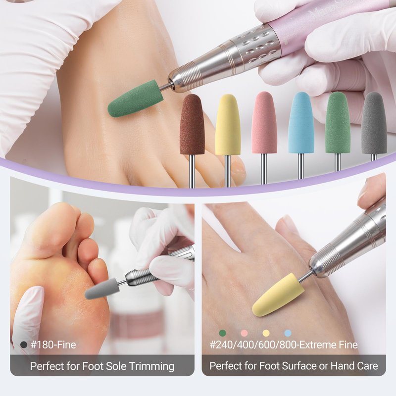 - Round Shape Silicone Pedicure Bits | Color & Grit: 180 Fine Grey, 240 Extreme Fine Green/Brown/Pink/Yellow/Blue | Shank Size: 3/32''. 180# fine grit perfect for foot sole trimming. 240/320/400/600/800# extreme fine grit perfect for foot surface or hand care.