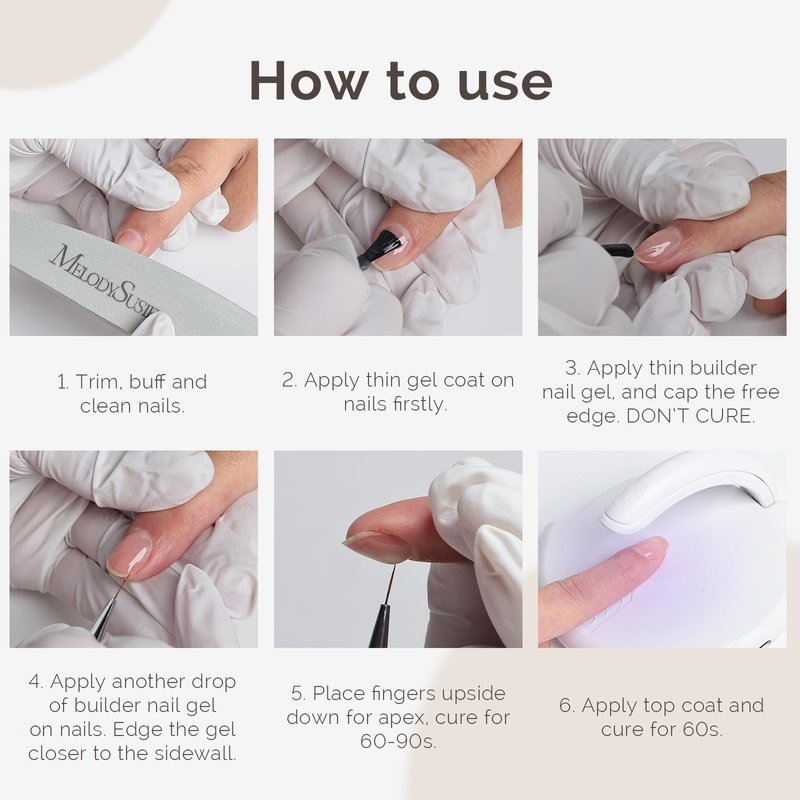 - MelodySusie 7 in 1 BUILDER THICKENING NAIL GEL: Designed with innovative formula, it's perfect for seven amazing uses including as thickening overlay, building apex, extending length, shaping nail, to attach false nail tips / gems / jewels and as a base gel.
